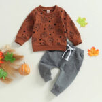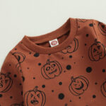 This adorable ensemble features playful pumpkin and polka dot prints that capture the essence of the season, making it the perfect outfit for your little one’s Halloween adventures.