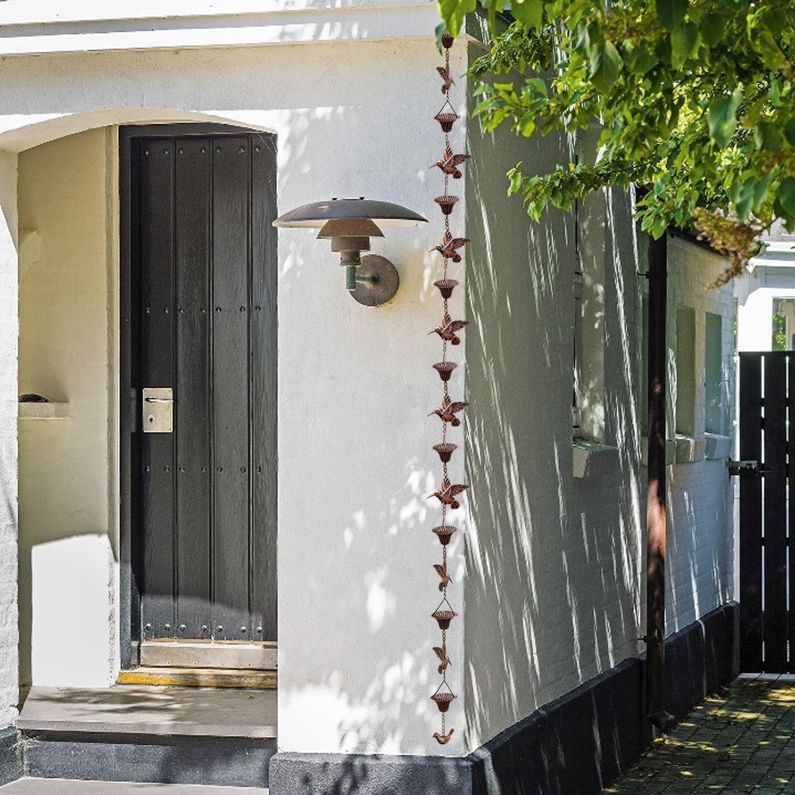 🕊️ Extra long rain chain – The rain chain for downspouts is 2.6m long, enough for most homes. The bronze finish matches your house perfectly. The flower cup captures most of the water and directs the rainwater to the ground.