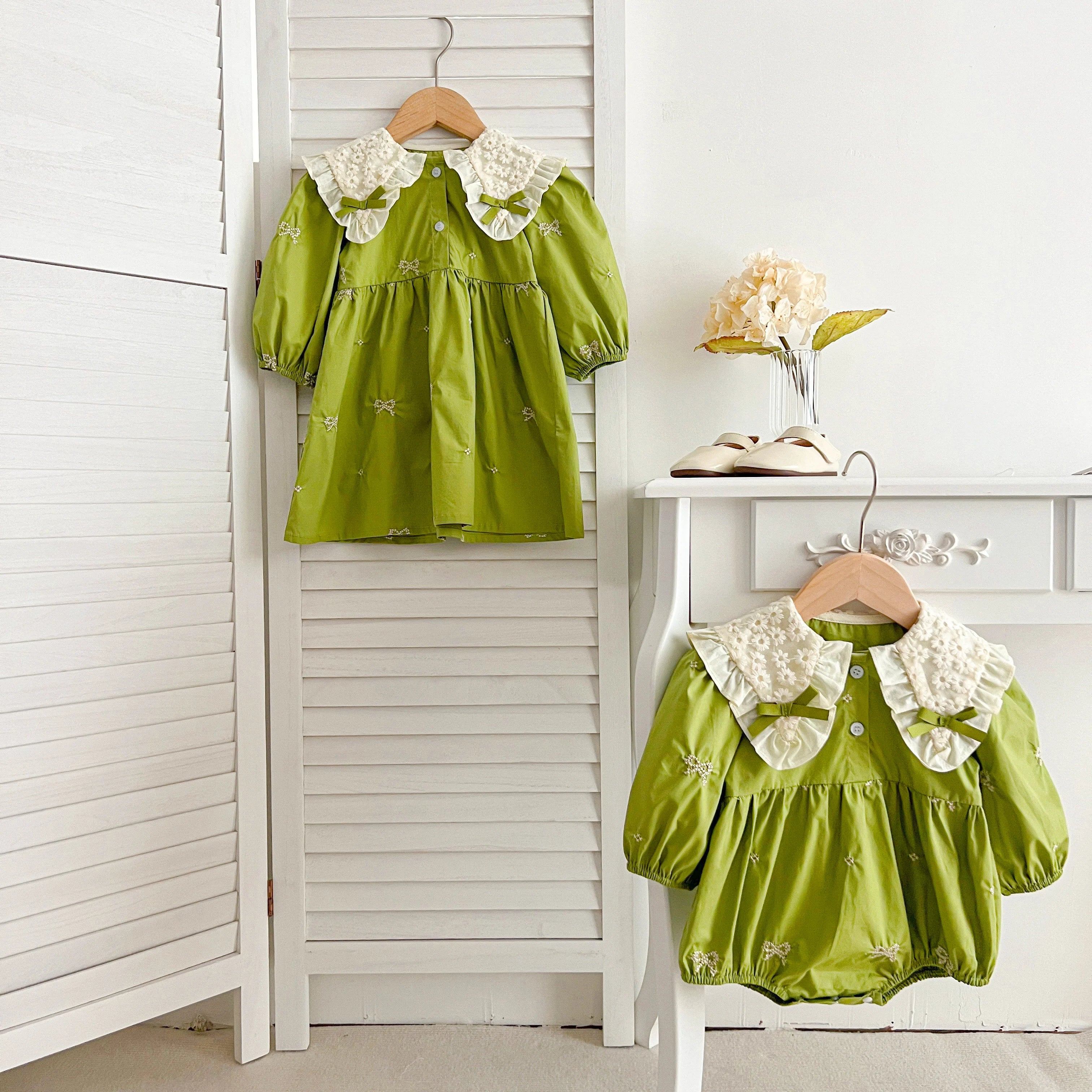 Dress your baby girls in our Matching Sisters Lace Collar Dress Rompers for a perfect blend of style, comfort, and cuteness. These outfits are sure to make your little ones look and feel like princesses.