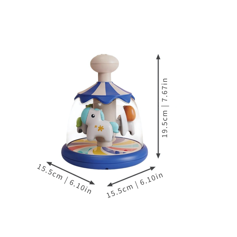 Give it a gentle push and watch the carousel spin into action. The colorful horses whirl around as the base wobbles slightly, inviting babies to reach, press, and explore. It’s designed for easy interaction, with just enough movement to spark curiosity without overwhelming the senses.