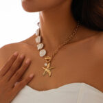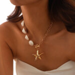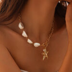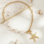 Delicate seashells are carefully paired with a radiant gold starfish pendant for balanced, eye-catching design.