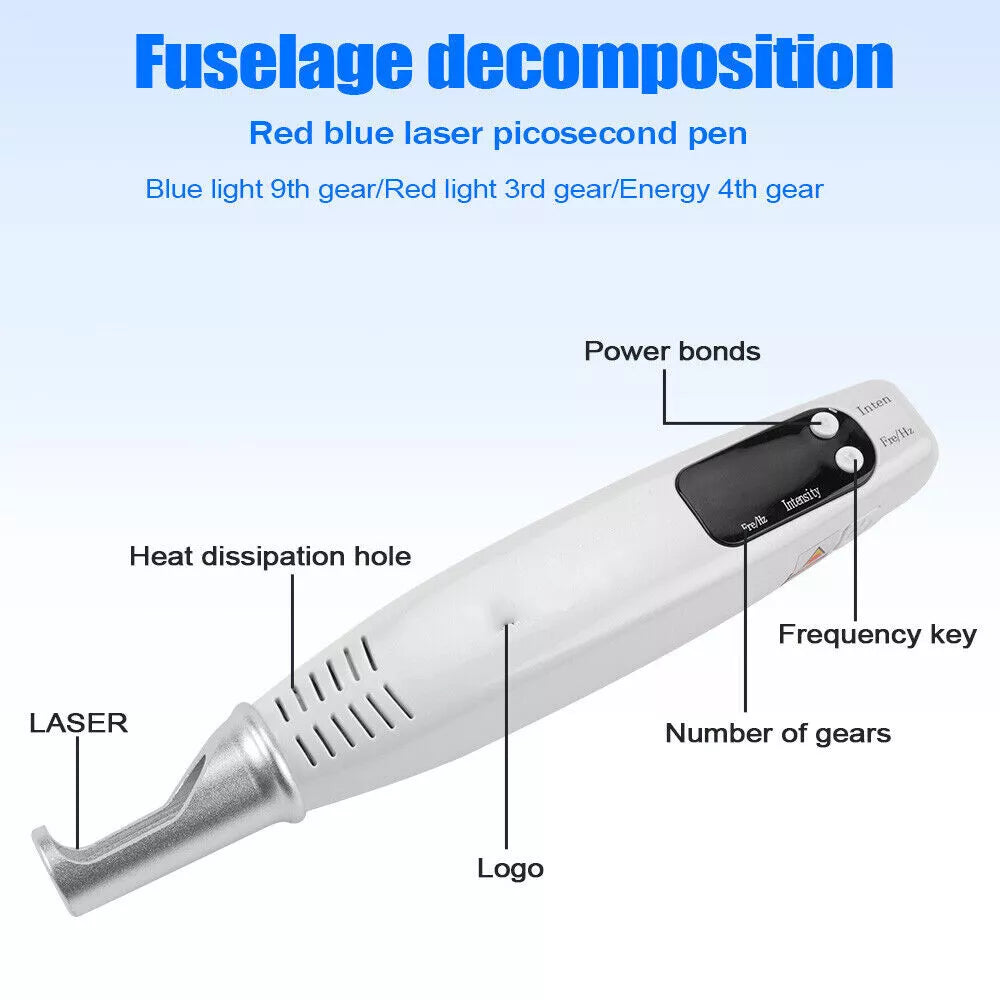 - Blue Laser Pen: Pulse 1-88 j/cm², Power 1500W, Wavelength 755nm; 9 output modes with varying frequencies. Suitable for colorful tattoos and professional applications.