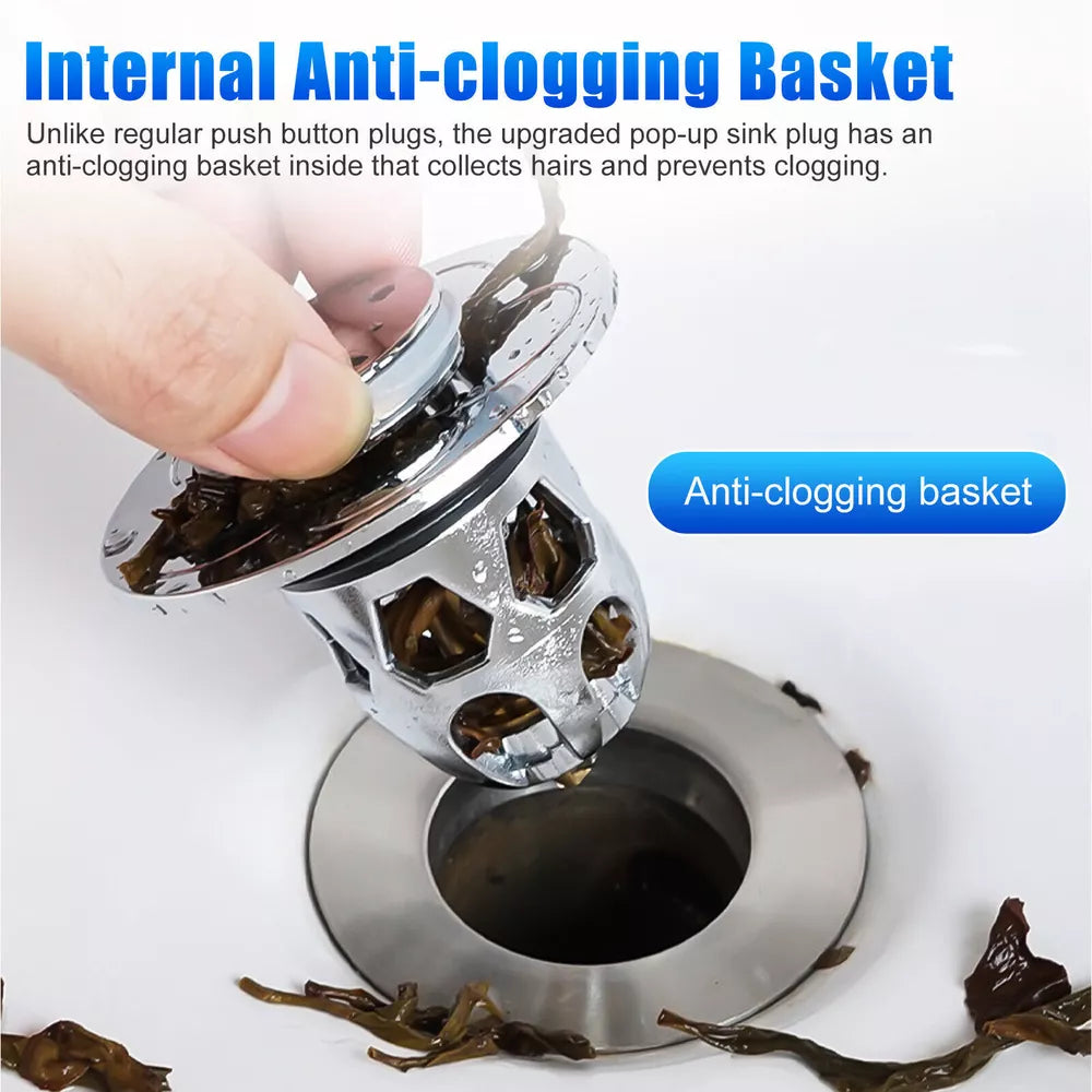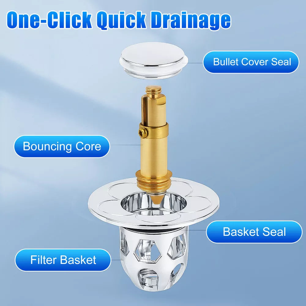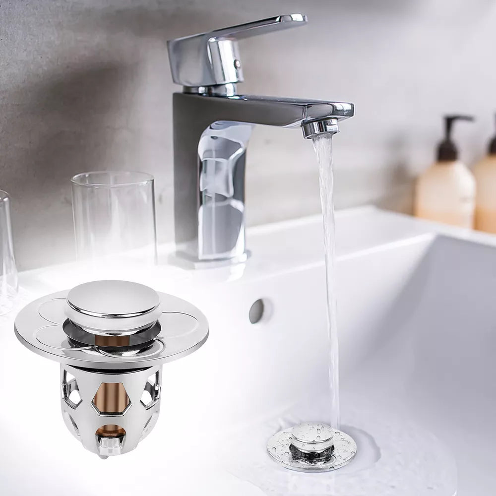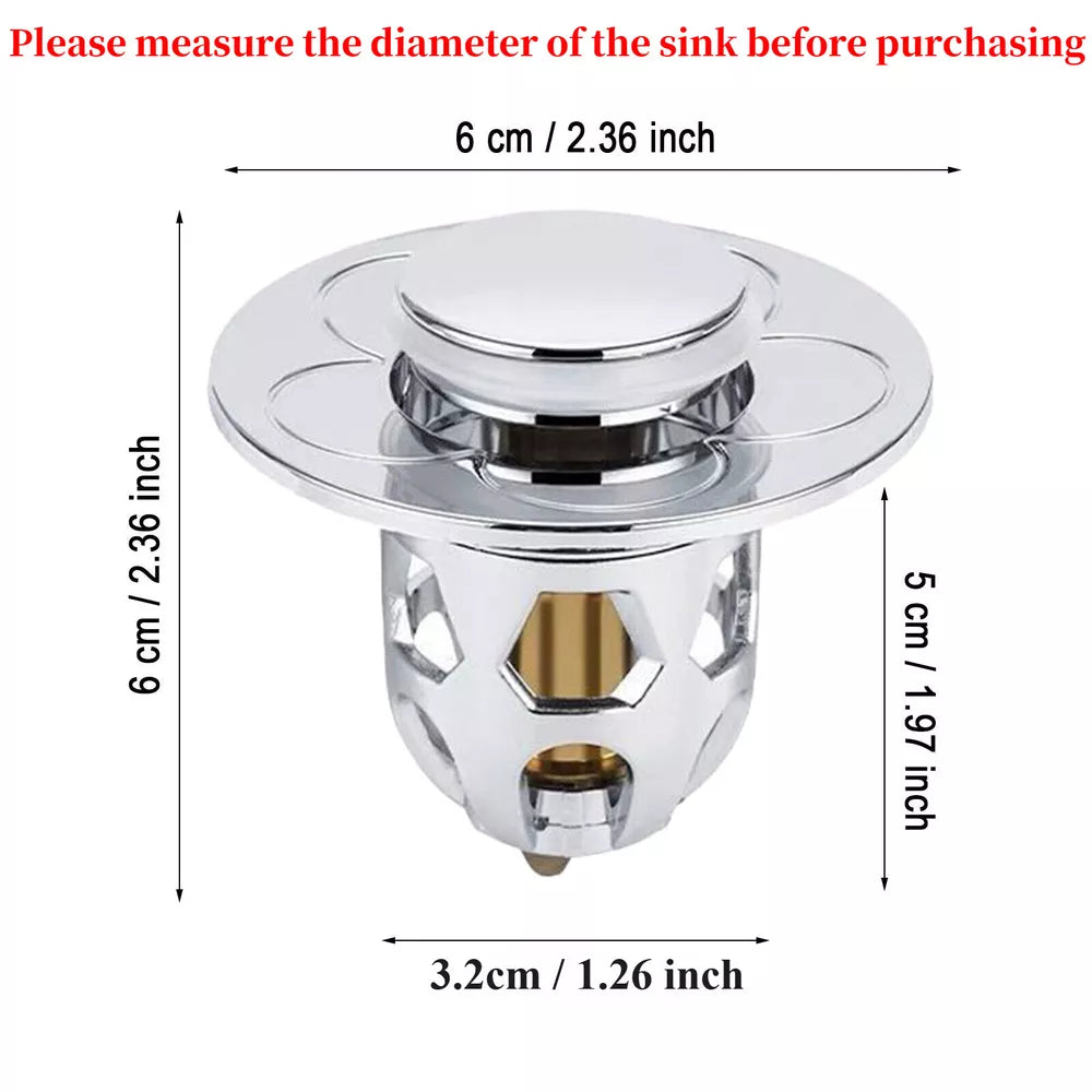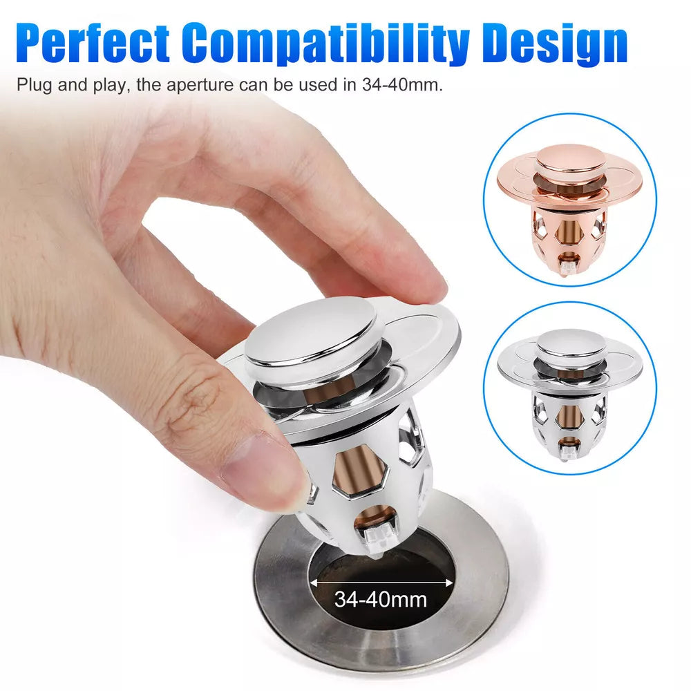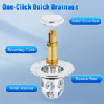 This innovative drain stopper features a compact design compatible with sink drain holes ranging from 34mm to 40mm (1.34″ to 1.57″). Its anti-clogging basket captures hair and small items, ensuring your drain stays clear. Made from high-quality stainless steel and brass, this stopper is resistant to cracking, water leakage, and rust, providing long-lasting performance. With a single press, you can quickly seal or drain water, thanks to its ergonomic design and reliable rebound strength.