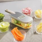 Long-lasting use: multi-functional vegetable slicer designed for high reliability, made of high-quality PET materials and food-grade stainless steel, equipped with a non-slip lid, ergonomically simple to use and easy to slice.