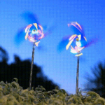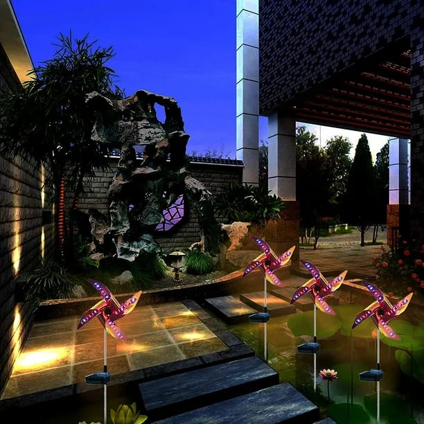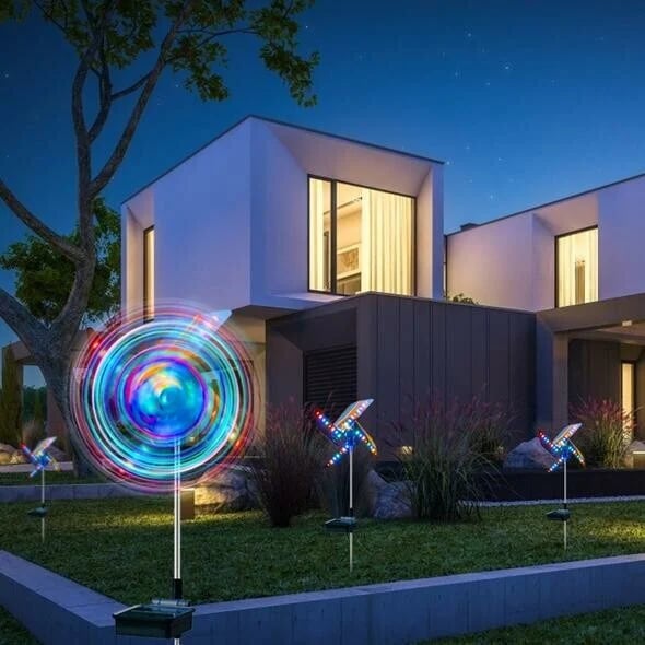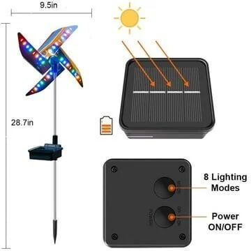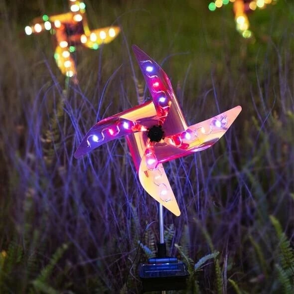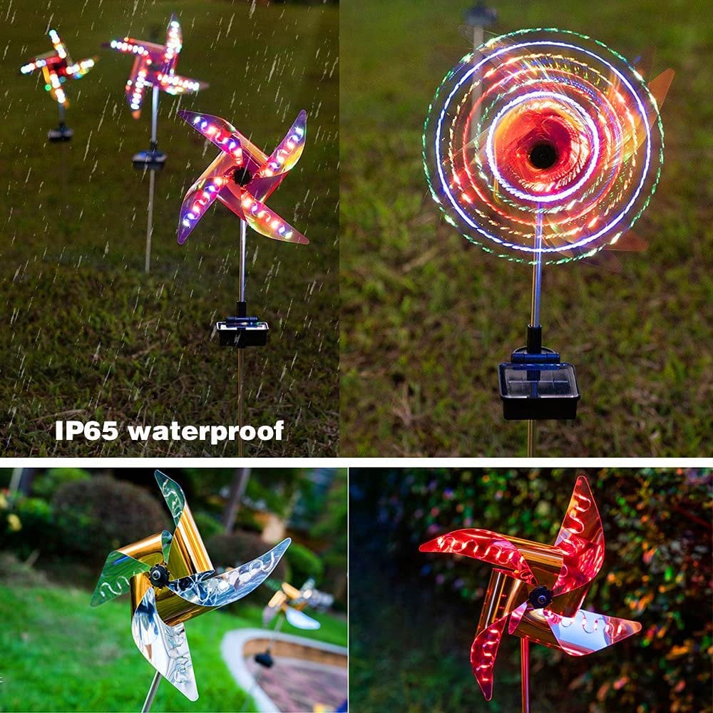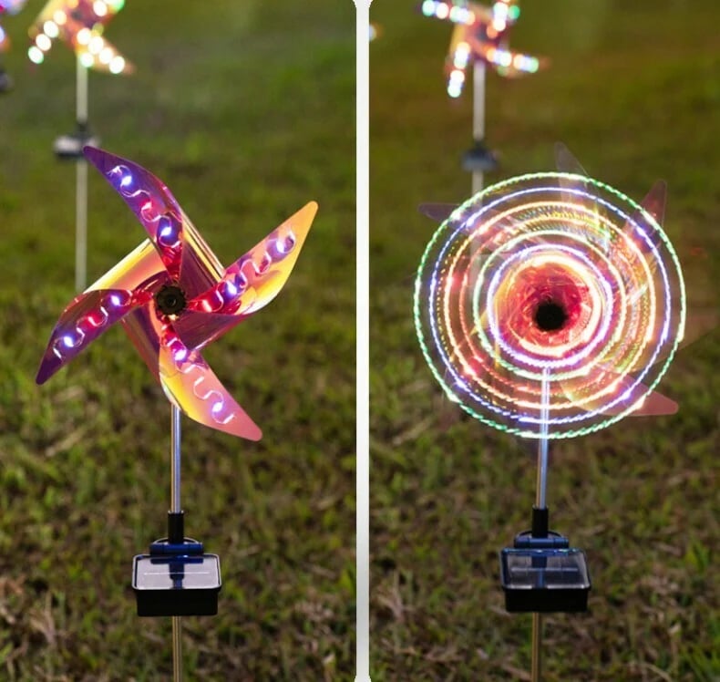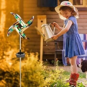 【Shining dreamy lights】The solar wind spinner is powered by solar panels. At nightfall, the windmill will light up with flashing lights in four colors: red, yellow, blue and green. The four blades will rotate continuously with the light cone.