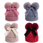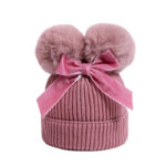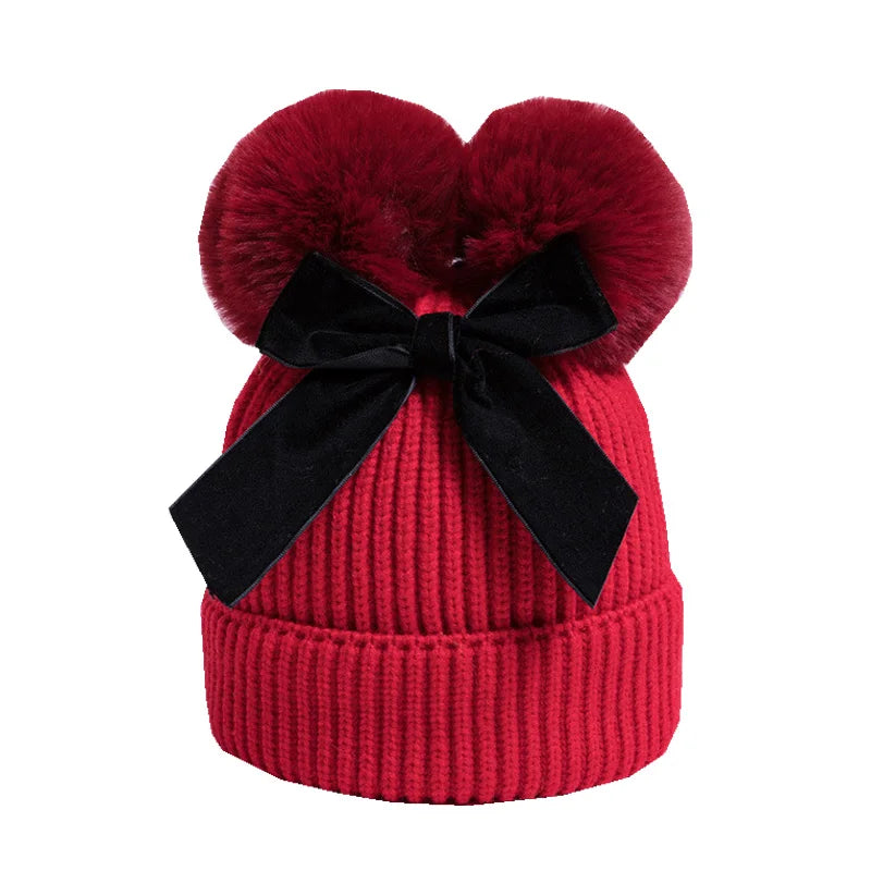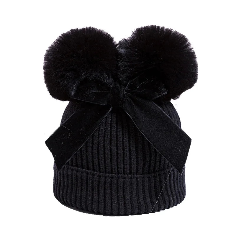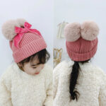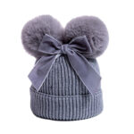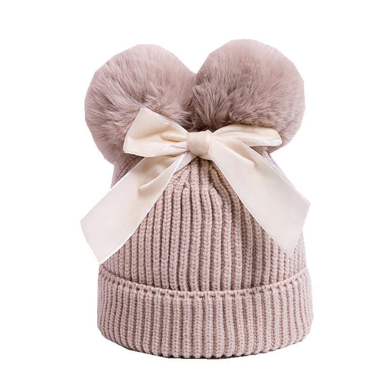 This is an adorable knit baby hat designed for winter warmth and style. It features a soft ribbed texture and two fluffy pom-poms on top, resembling cute animal ears. A cream-colored bow is tied in the center, adding a charming and elegant touch to the design. The hat is cozy, stretchy, and perfect for keeping little ones warm while enhancing their outfit with a playful and fashionable look.