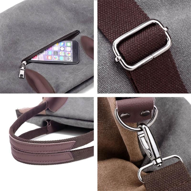 😋 This tote type of bag is great looking one. With its canvas materials and its unique design with 3 straps of handles, you will not be able to put it down for another bag. Silt pocket bag will quickly become your go-to bag for your daily chore and casual evening out. Its interior also has multiple pockets with zippers to keep all your stuff from moving around and mix up. Take a look and you will want to order one