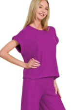 A rolled sleeve top and pants sweater set is a chic and coordinated outfit that offers both style and comfort. The rolled sleeve top features a relaxed fit and rolled cuffs for a casual and laid-back look. Paired with matching pants, this sweater set creates a trendy and put-together ensemble that is perfect for lounging at home or running errands in style. The sweater set is typically made from a cozy knit fabric that provides warmth and softness, making it a comfortable choice for cooler days. Whether you’re relaxing indoors or stepping out for a casual outing, the rolled sleeve top and pants sweater set offers a fashion-forward and effortless option for a coordinated look.